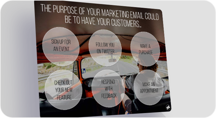 The Purpose of your MARKETING email could be to have your customers… Sign up for Follow you Make a an event on Twitter purchase Check out Respond Make an your new with appointment feature feedback