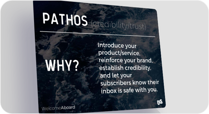 Pathos (credibility/trust) Introduce your product/service, reinforce your brand, WHY? establish credibility, and let your subscribers know their inbox is safe with you. WelcomeAboard