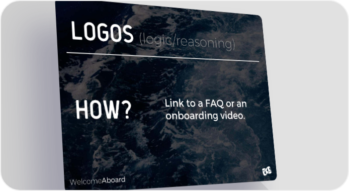 Logos (logic/reasoning) HOW? Link to a FAQ or an onboarding video. WelcomeAboard Welcome Email Page 12 Page 14
